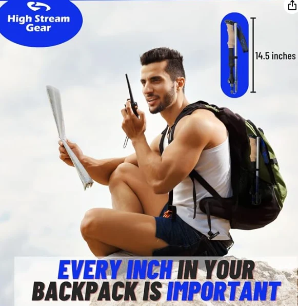 Stâlpii de drumeție pentru hikiori se prăbușesc până la 37 cm (14,5 inci) și cântărește doar 10 uncii, fiecare părăsindu -vă loc pentru elementele esențiale și echipamentul personal.