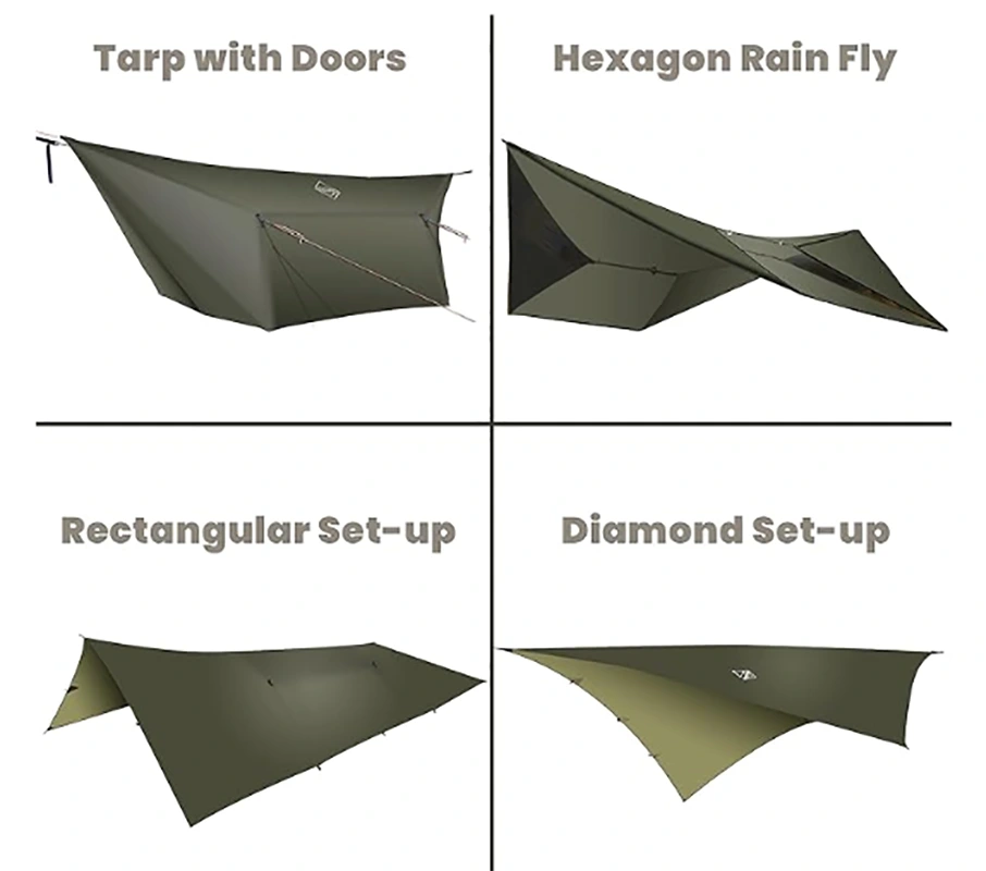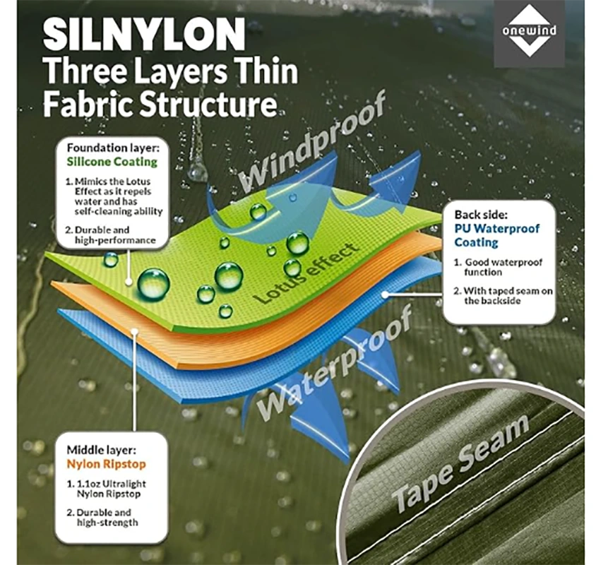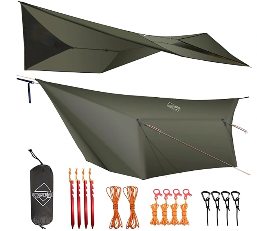 Hamacul portabil de camping rezistent la apa ofera o protectie excelenta impotriva elementelor - ploaie, soare, razele UV si vant. Este fabricat din silnylon ripstop 20D de 1,1 oz care este tratat cu silicon/PU 4000 mm, ceea ce face ca materialul să fie rezistent la apă.