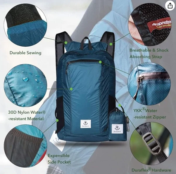 Rucsac de drumeție ușor impermeabil, rucsac pliabil oferă suficient spațiu pentru călătorii în aer liber, camping, drumeții, excursii de o zi și cumpărături. Vine cu un buzunar principal cu fermoar, un buzunar cu fermoar față și două buzunare laterale cu plasă.Zhejiang Jiayu Outdoor Products Co., Ltd. Vrem să ne asigurăm că aveți o experiență uimitoare cu noi. 30 de zile fără returnări / schimb gratuit, garanție de 12 luni.